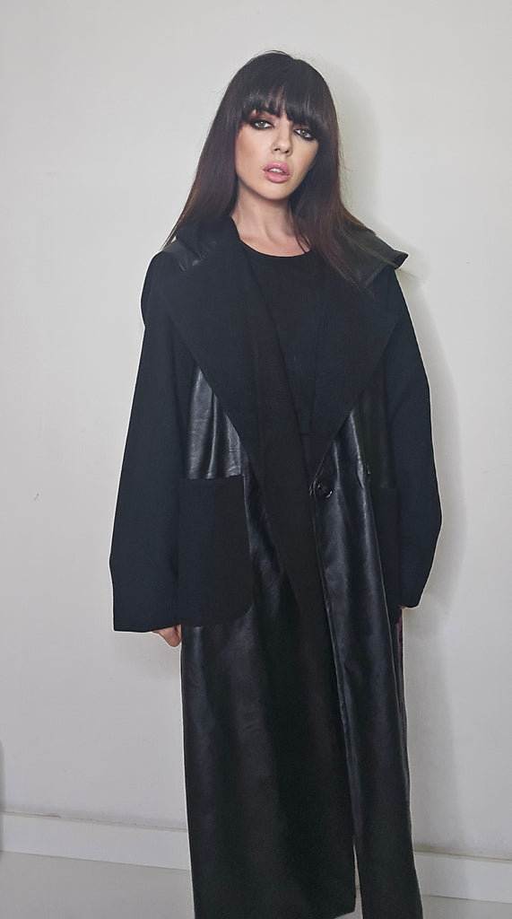 Abrigo pantera rosa combinando paño y polipiel, con capucha, bolsillos y cierre con botones.