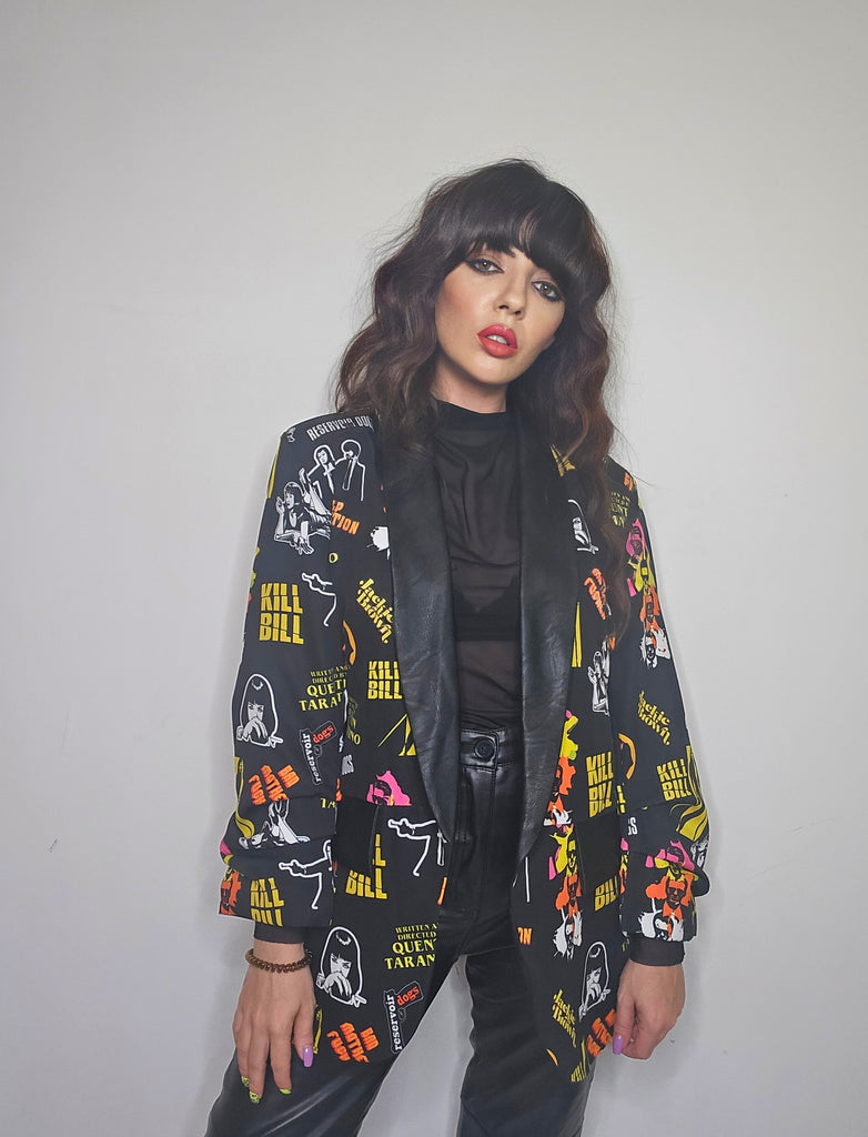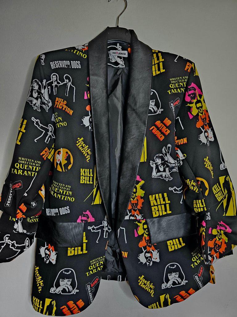 Americana con hombreras y forro, solapa y bolsillos falsos en polipiel