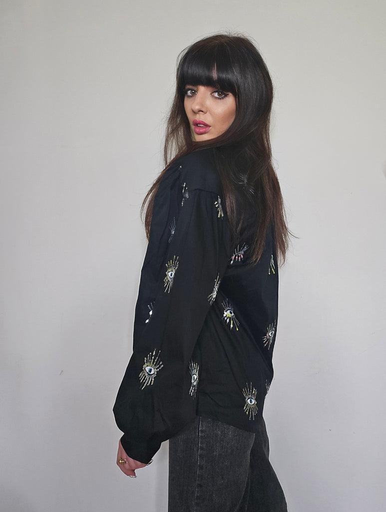 DETALLES: Bordados de ojos con lentejuelas distribuidos por toda la prenda, cierre frontal con botones, cuello camisero clásico y manga larga con puño.