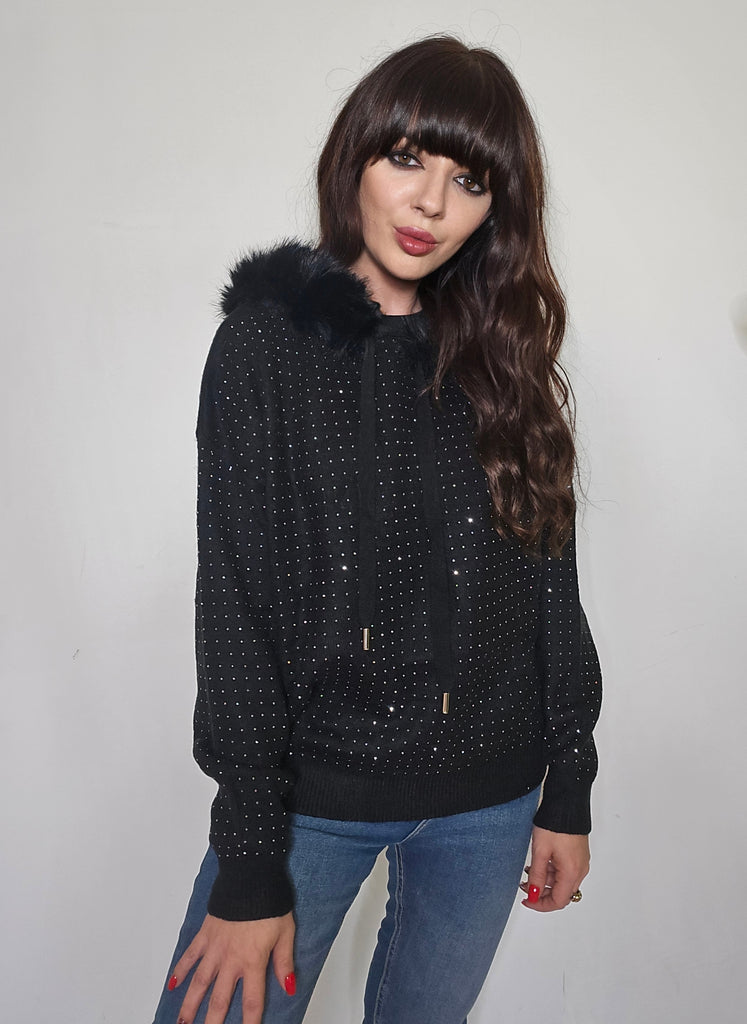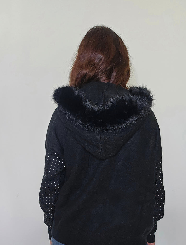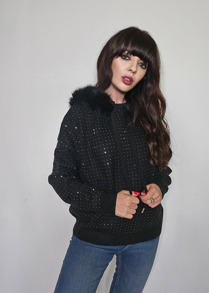 Jersey tipo sudadera de punto con capucha con detalles de pelito y brillos por toda la parte delantera.