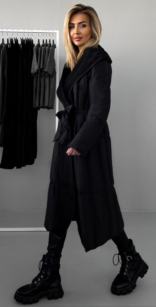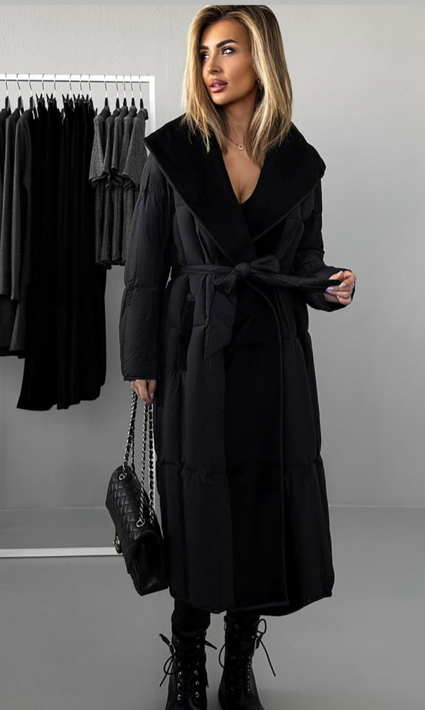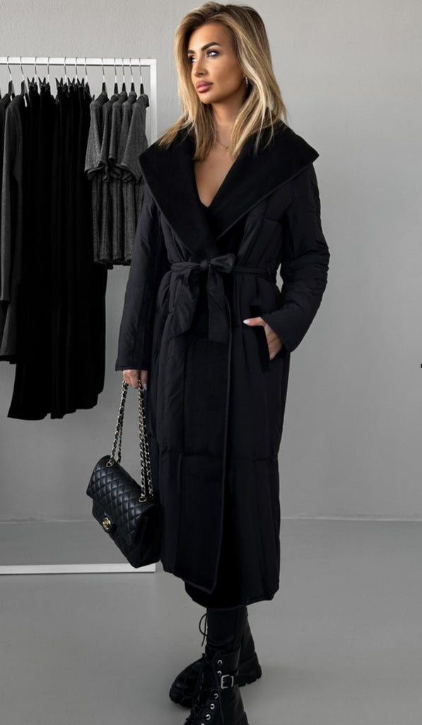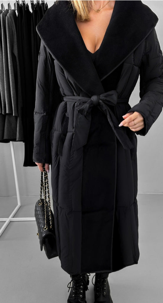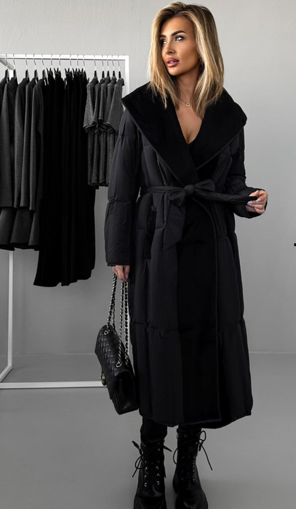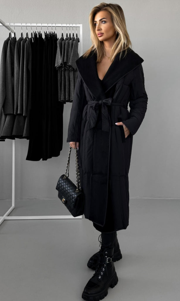 Cuello de paño y cinturón acolchado