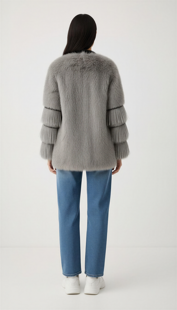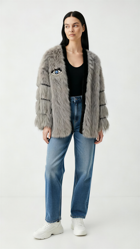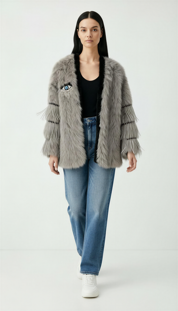 Abrigo de pelo con parche de ojo en strass y flecos de strass en las mangas.