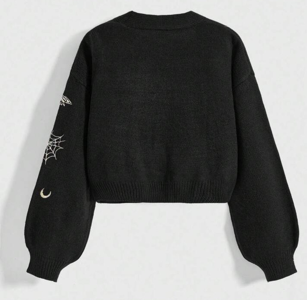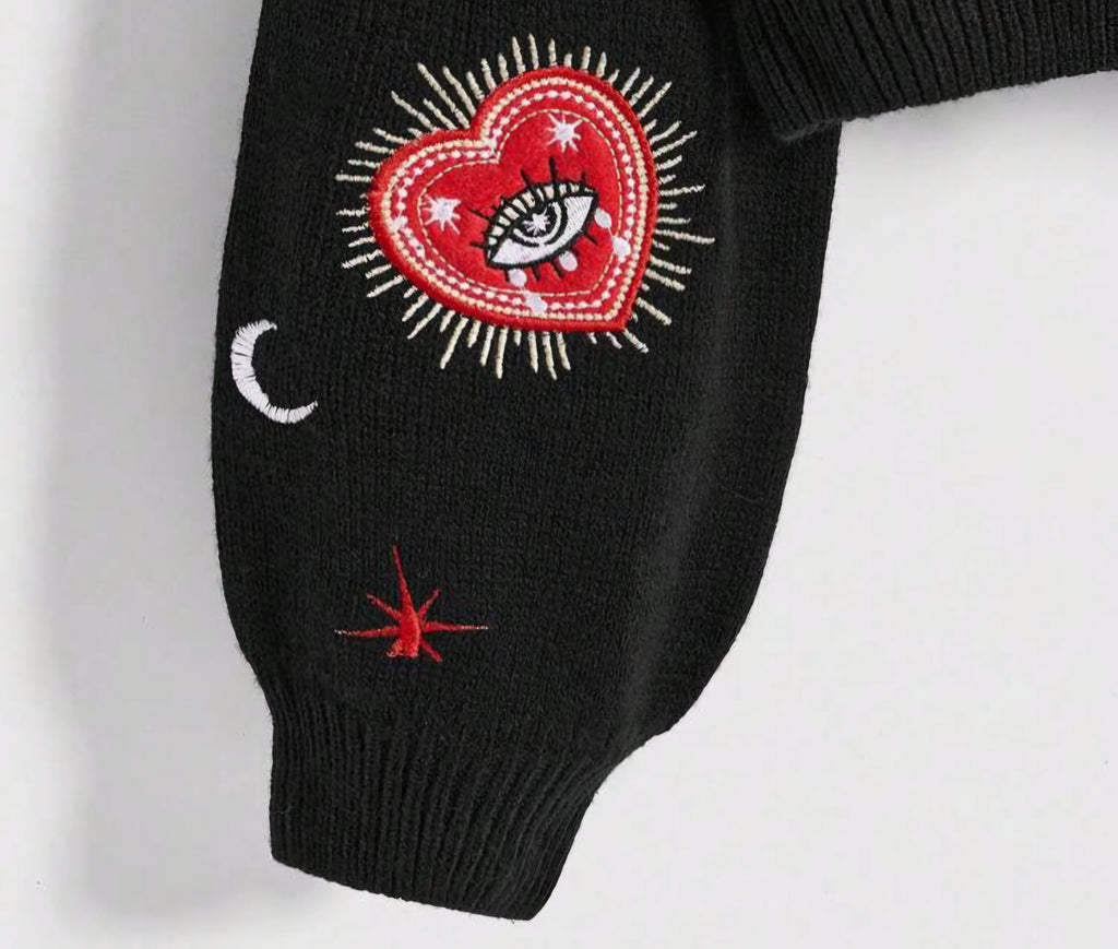 Cárdigan de punto con escote en V bordado con corazón, ojo, sol, luna, estrella y polilla